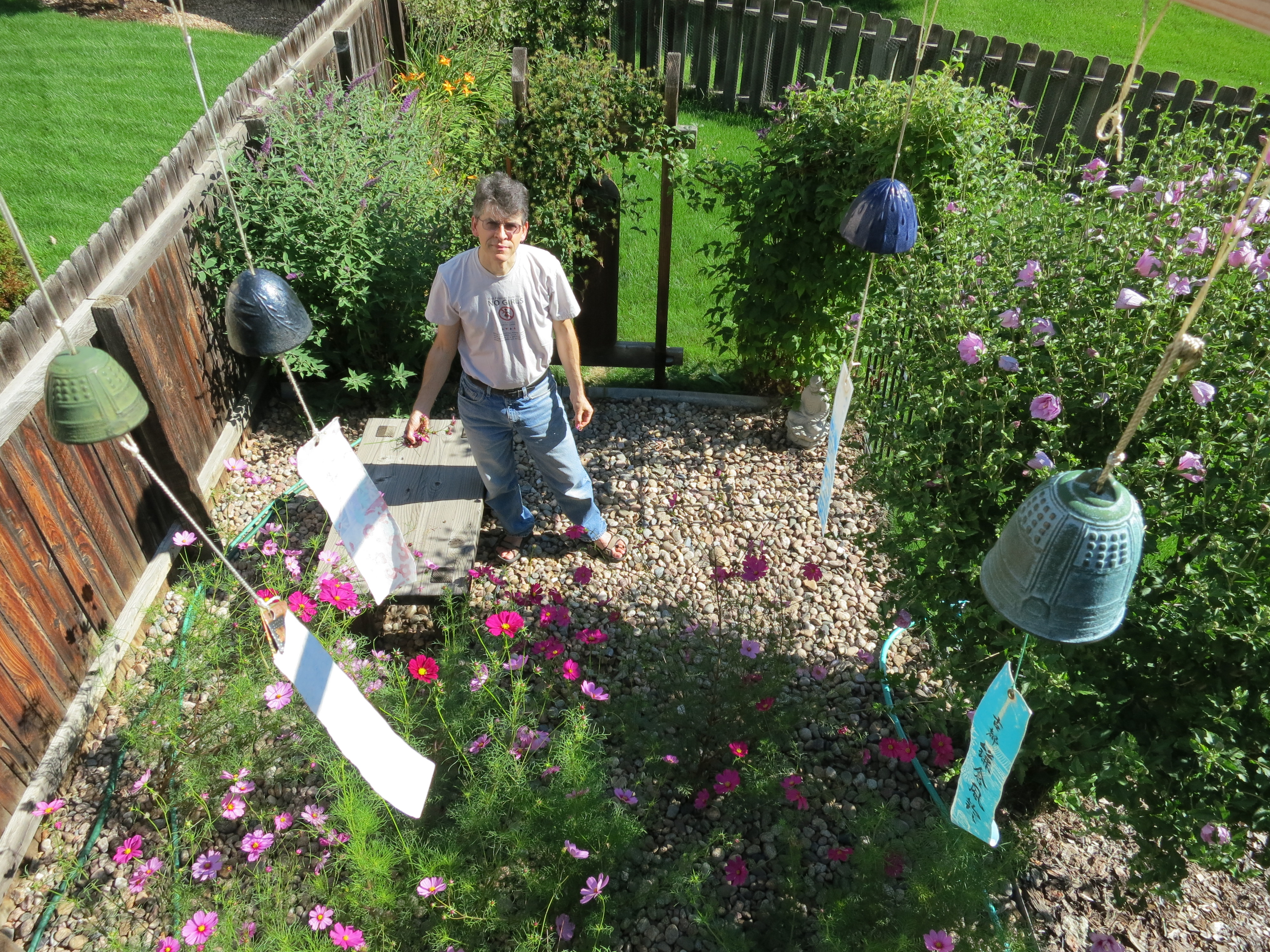 That’s me amongst the flowers in the back yard, bracketed by bells we’ve brought back from Japan. The flowers in front of me bear some mention because they’re actually not supposed to be there. They sprouted from seeds which fell from potted plants on the deck above and they’re growing in what’s supposed to be plant-free gravel. If I was smart, I would have pulled them when they came up, because their roots are certainly damaging the landscaping cloth which is underneath the gravel. Indeed, I did pull a number of other plants that sprouted in the same area. However, I am fond of cosmos, and couldn’t bring myself to pull the little ones. So, now I have a small forest of them. I’ve been trying to cut the dead flowers before they go to seed, in hopes of not encouraging another forest next year, but we can all guess about my willpower to exterminate that forest when it’s young.